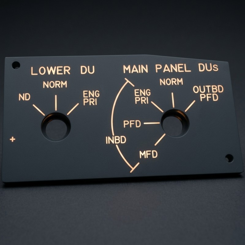1st officers side Lower DU/Main Panel DUS control panel for Boeing 737. Made from high quality plastic, Professioanlly sprayed to match Boeing 737 panels. Laser engraving to ensure the best quality to give it that genuine Boeing 737 look. You will receive