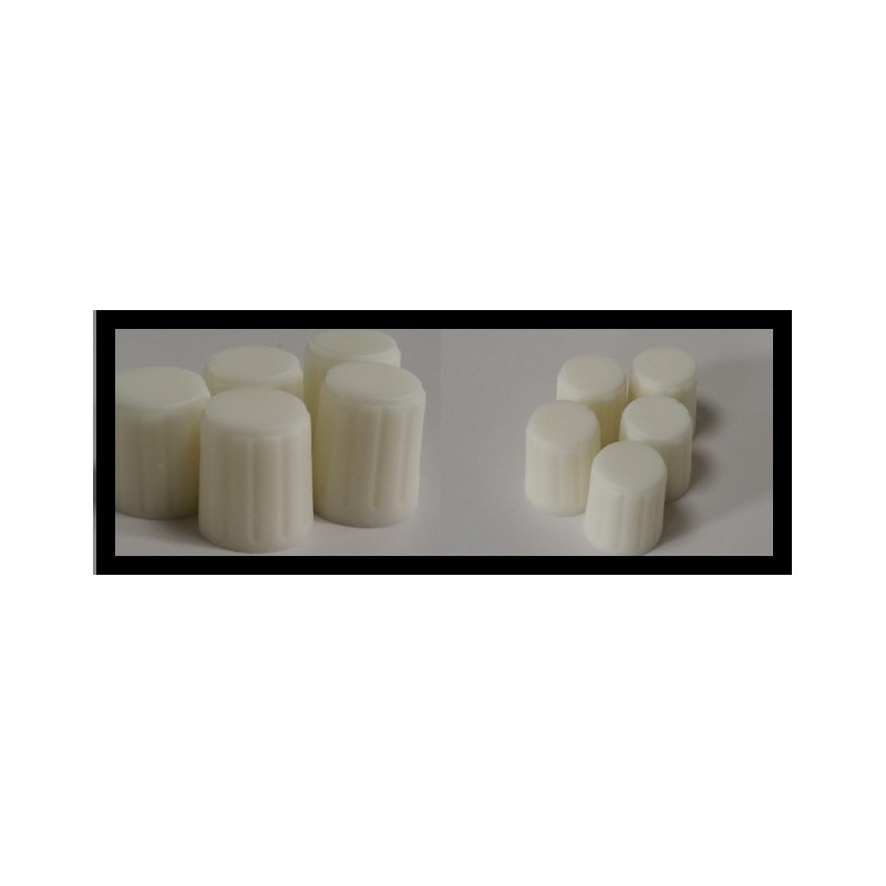 Style 5 knobs, unpainted. Moulded from strong plastic, Easy drilling for holes at the bottom to bit to either pots or rotary switches.